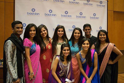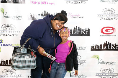 Family of three posing together in front of a branded backdrop