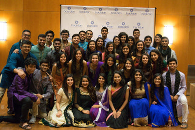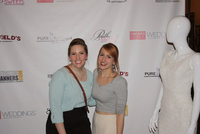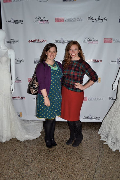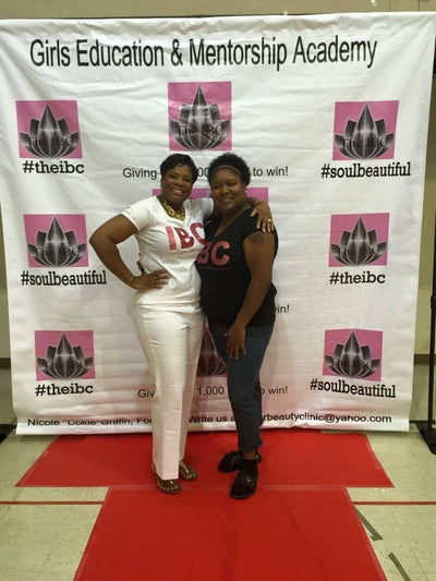 Two people posing together at an event with a branded backdrop