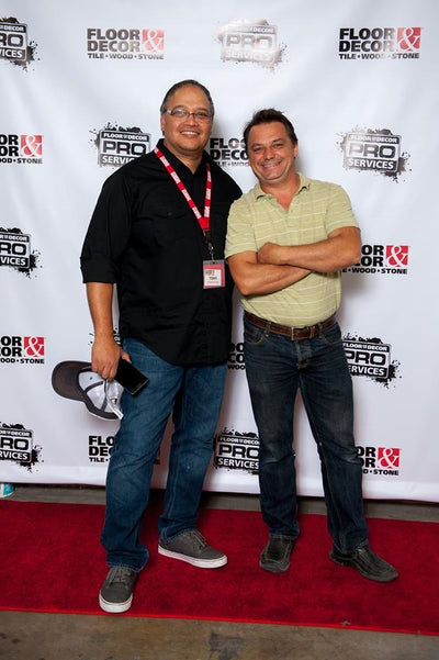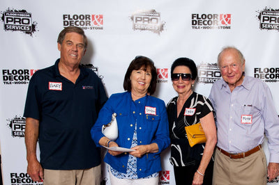 Group of men posing in front of a branded backdrop with 'Floor & Decor' and 'Pro Services' logos.
