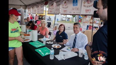 Two people standing in front of a promotional backdrop with logos and text.